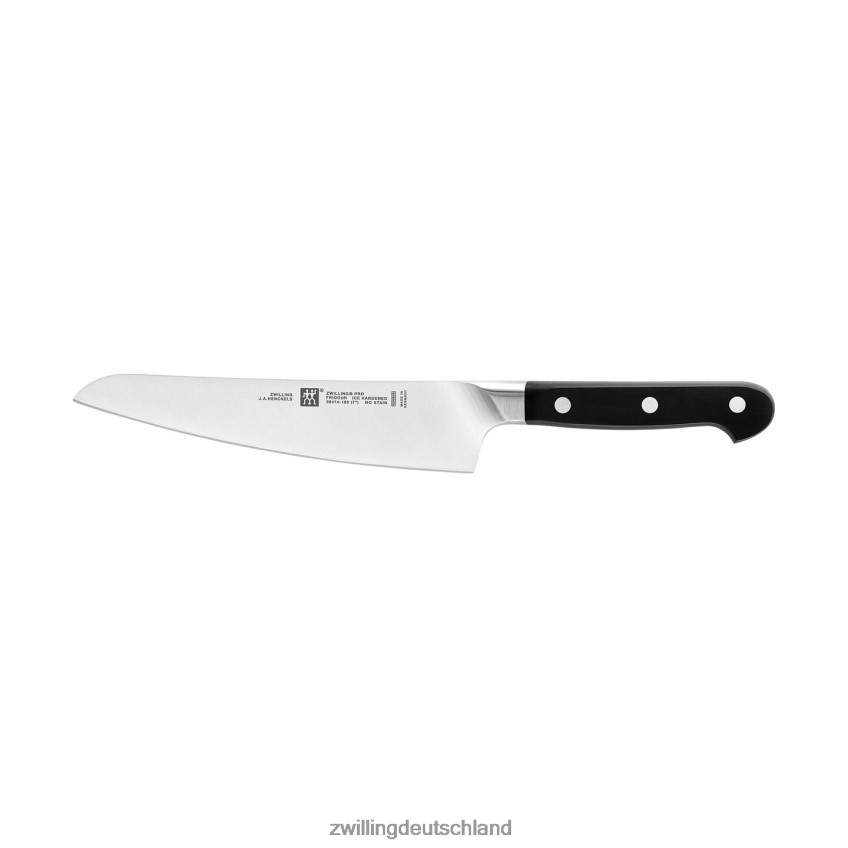 Zwilling Pro verfügt über einen einzigartigen gebogenen Kropf, der als Verlängerung der Hand fungiert und den professionellen Pinch-Griff mit Daumen und Zeigefinger unterstützt auf der Klinge, für sicheres Schneiden und weniger Ermüdung. Die Klinge wurde mit einer breiten Krümmung an der Vorderseite entworfen, um die Schaukelbewegung beim westlichen Schneiden zu erleichtern, während die gerade Rückseite ideal für die Hackbewegung ist, für die japanische Messer entwickelt wurden.Die gesamte Länge der Klinge kann beim Schneiden genutzt werden und kann vom Backen bis zur Spitze geschärft werden.